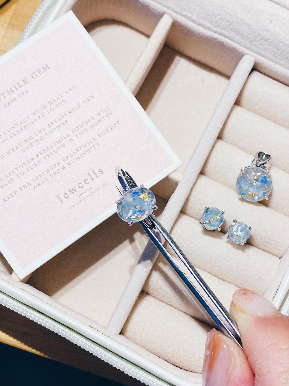 BreastmilkGems™ is created with breastmilk powder, birthstones and corresponding colours. The preservation method of BreastmilkGems™ is a bit different from the traditional method as it keeps the original colour of breastmilk which the colour defers from each other because each mum's breastmilk has different components in it, therefore each breastmilk colour is unique. We will choose the colour combination for the gem base by selecting the birthstones and birthcolours of the mum, baby and daddy. The gem is created with Japanese high quality resin which will not turn yellow over time.